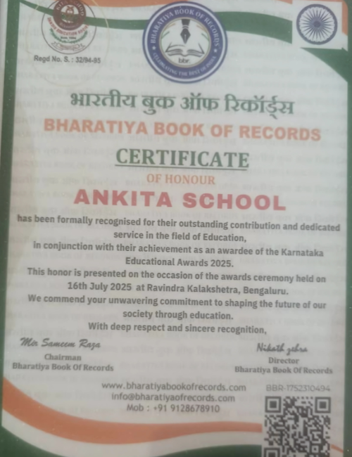 Ankita School was formally recognized by the Bharatiya Book of Records for our outstanding contribution and dedicated service in the field of education.